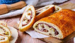 Ingredientes: Para la masa del pan de jamón: 500 g. de harina de trigo, 35 g. de leche en polvo, 250 ml. de agua tibia, 6 g. de levadura seca de panadero o 18 g. de levadura prensada de panadería, 1 huevo, 5 g. de sal, 25 g. de azúcar, 50 g. de mantequilla, un poco de aceite para engrasar. Para el relleno: 400 g. de jamón ahumado, 10-12 tiras de panceta o bacon ahumado, 40 g. de uvas pasas sin hueso, 100 g. de aceitunas rellenas de pimiento. Antes de hornear: 1 huevo para pincelar.
